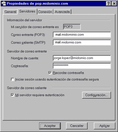 Los nombres de los servidores, tanto el entrante como el saliente es: mail.midominio.com