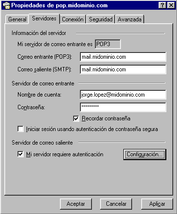 Los nombres de los servidores, tanto el entrante como el saliente es: mail.midominio.com
